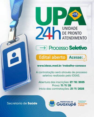 A Prefeitura de Guaxupé, por meio da Secretaria Municipal de Saúde, anunciou a abertura do processo seletivo para a Unidade de Pronto Atendimento (UPA 24h).