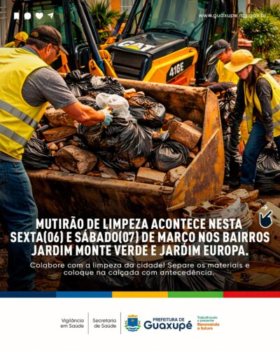 A Prefeitura de Guaxupé realizará nesta sexta-feira (6) e sábado (7) de março um mutirão de limpeza nos bairros Jardim Monte Verde e Jardim Europa.