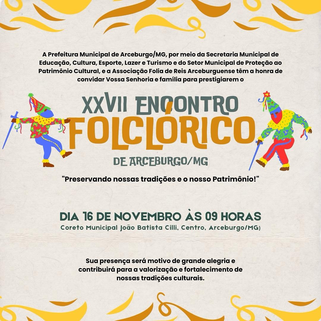 Arceburgo celebra no próximo domingo, 16 de novembro de 2025, um dos eventos culturais mais tradicionais do município: o XXVII Encontro Folclórico, que ocorre a partir das 9h no Coreto Municipal João Baptista Cilli, na Praça Dr. Herculano de Paula Borges, região central da cidade.