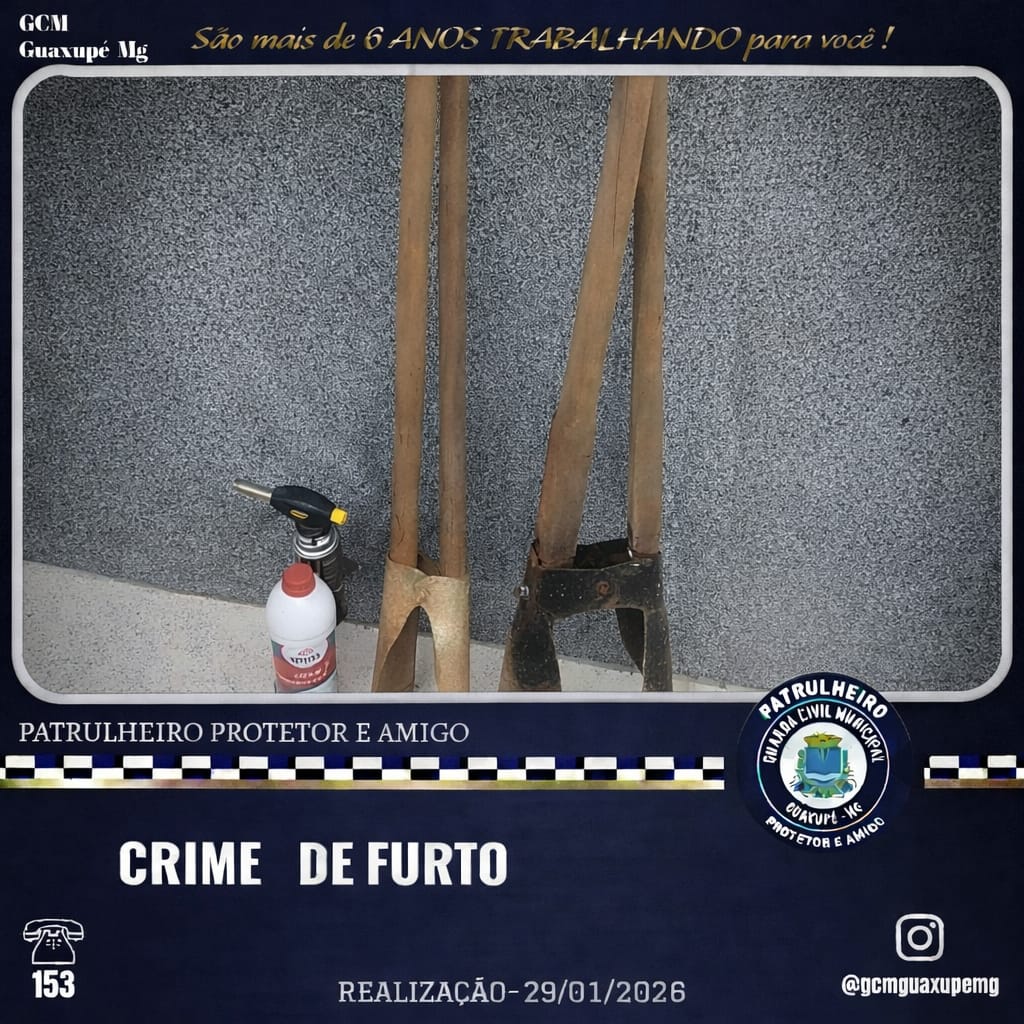 A Guarda Civil Municipal prendeu um homem suspeito de furtar materiais de construção pertencentes a uma empresa terceirizada que presta serviços à Prefeitura de Guaxupé (MG). A ocorrência foi registrada após uma denúncia anônima recebida pelo canal 153. Segundo a GCM, a informação indicava que itens estavam sendo subtraídos de um canteiro de obras localizado atrás da Unidade de Pronto Atendimento (UPA). Com base na denúncia, uma guarnição realizou patrulhamento preventivo no bairro Planalto. Durante a ação, o suspeito foi localizado nas proximidades de uma praça, próximo ao campo de futebol do bairro, transportando diversos equipamentos. Na abordagem, os agentes apreenderam duas cavadeiras de boca, um nível, uma serra, um maçarico e um tubo de cola adesiva plástica. Questionado pelos guardas, o homem confessou o furto dos materiais na obra citada. O responsável pela empresa terceirizada compareceu ao local e reconheceu os objetos como sendo de propriedade da empresa. Diante dos fatos, foi dada voz de prisão ao suspeito, que foi encaminhado para a Delegacia de Polícia Civil, juntamente com os materiais apreendidos.