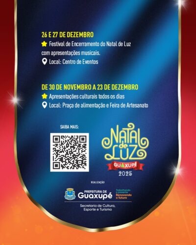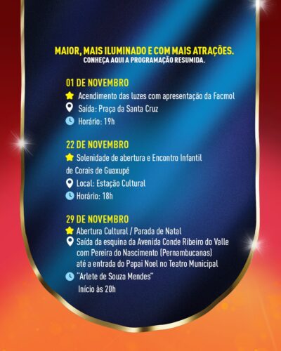 Durante mais de dois meses, Guaxupé será palco de um verdadeiro espetáculo de cores, música e magia, com atividades voltadas para toda a família. A abertura oficial será no dia 1º de novembro, com o tradicional acendimento das luzes natalinas, ao som da renomada Facmol – Fanfarra Municipal de Leme.