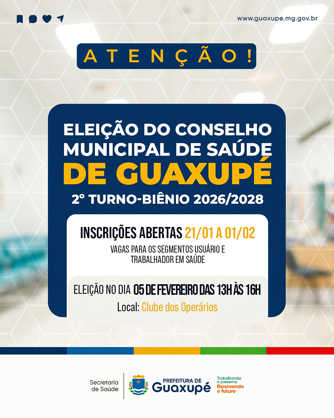 Estão abertas as inscrições para o segundo turno da Eleição do Conselho Municipal de Saúde de Guaxupé, referente ao biênio 2026/2028. O processo visa ao preenchimento de vagas destinadas aos segmentos de usuários do Sistema Único de Saúde (SUS) e trabalhadores da área da saúde.