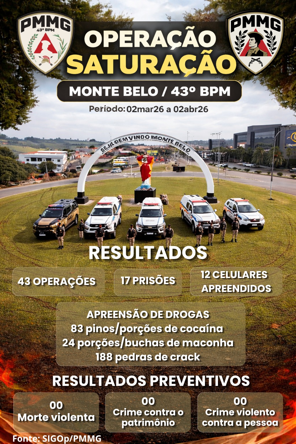A Polícia Militar de Minas Gerais, por meio do 43º Batalhão realizou a Operação Saturação em Monte Belo (MG), entre os dias 2 de março e 2 de abril de 2026. A ação foi desencadeada como resposta aos registros de ocorrências criminais no início do ano e teve como principal objetivo intensificar a presença policial, ampliando a sensação de segurança da população. Com atuação integrada das Patrulhas Rurais de Guaxupé, Muzambinho, Nova Resende e Guaranésia, além de equipes do Tático Móvel e apoio aéreo, a operação resultou na realização de 43 ações policiais, com 17 prisões efetuadas e 12 aparelhos celulares apreendidos. As ações foram direcionadas principalmente ao combate ao tráfico de drogas e à prevenção de crimes. Durante o período, também foram apreendidas 83 porções de cocaína, 24 porções de maconha e 188 pedras de crack. Outro destaque foi o resultado preventivo da operação: não houve registros de morte violenta, crimes contra o patrimônio ou crimes violentos contra a pessoa, evidenciando a eficácia das estratégias adotadas. Segundo a PM, os números reforçam o impacto positivo da operação e o compromisso contínuo com a segurança da comunidade local.