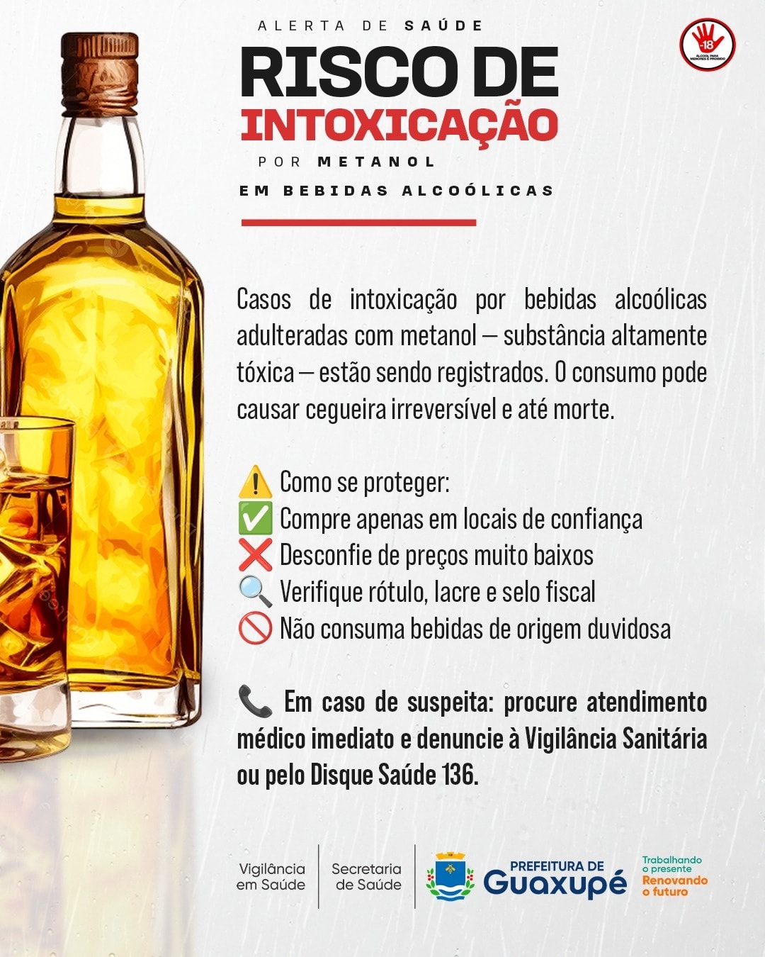 Atenção! Casos de intoxicação por bebidas alcoólicas adulteradas com metanol (álcool altamente tóxico) têm sido registrados em diferentes regiões. O consumo de bebidas contaminadas pode causar danos irreversíveis à saúde e até levar à morte.